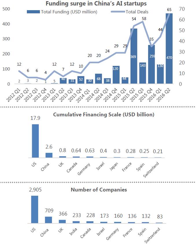 近年来,中国市场见证了人工智能投资的热潮。据网易报道,在 2016 年共有 202 家人工智能初创公司获得了共计 10 亿美元的融资。毕马威的研究也显示了近年来投资机构对于国内人工智能公司的偏爱,并预计这一势头将在未来持续。在乌镇峰会上发表的报告中显示,去年国内公司在人工智能领域的投入达到了 26 亿美元,而美国同期的数字为 179 亿美元。