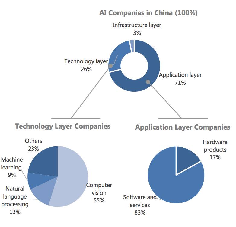 中国的人工智能生态系统包含大型互联网企业以及新兴的垂直公司。下面从应用层、技术层以及基础层三个方面进行分析。