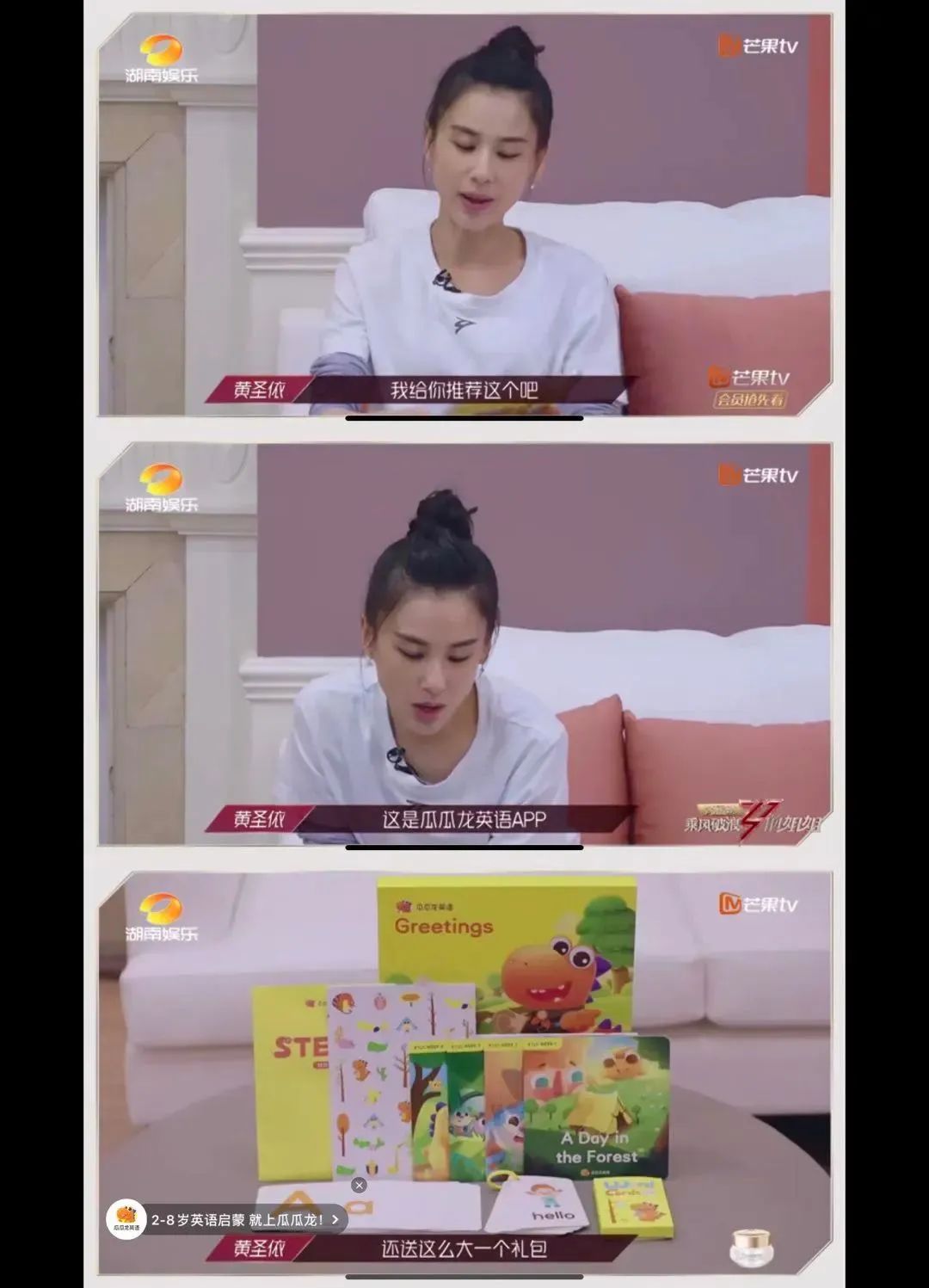 同样的情况还有瓜瓜龙。在第四期节目中,黄圣依和蓝盈莹两人聊到孩子各自的孩子,突然话题一拐讲到现在孩子学英语有困难,黄圣依立马拿起平板开始介绍瓜瓜龙,接着就是一段瓜瓜龙APP页面的展示画面外加功能介绍式的广告语,多少还是略显刻意。