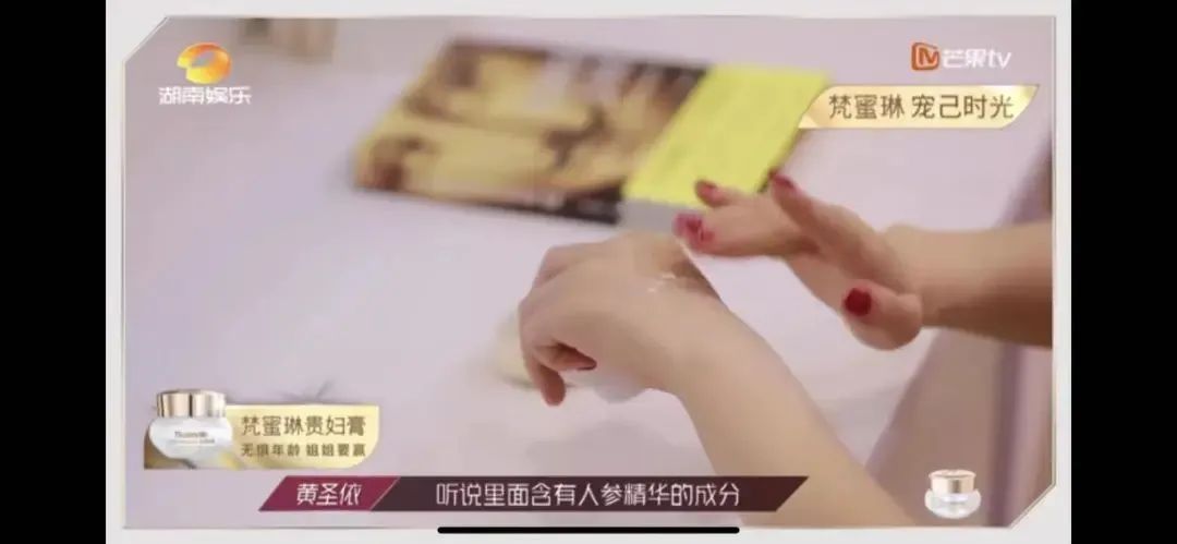 在植入方式上,品牌大都选择不需要太耗费创意头脑的硬广式植入方式,软性植入玩法还是相对较少。拿明星口播来说,梵蜜琳本有非常天然的植入场景,特别是姐姐们在宿舍休息时进行护肤,直接展现出姐姐使用产品后的皮肤状态,效果就已经足够。但是梵蜜琳总选择广告语式的口播方式,比如黄圣依直接拿贵妇膏往手上涂抹,边说出贵妇膏的主打功能,这就显得颇为生硬。