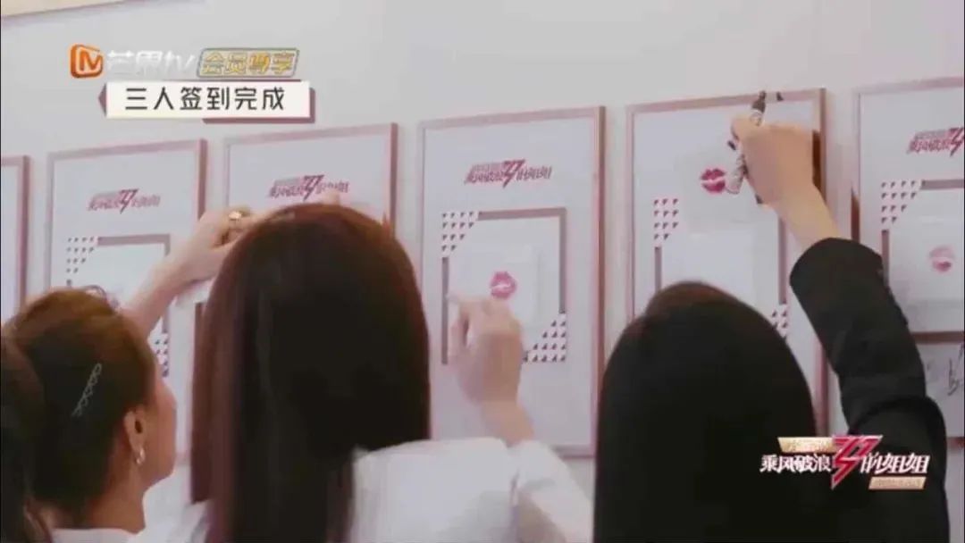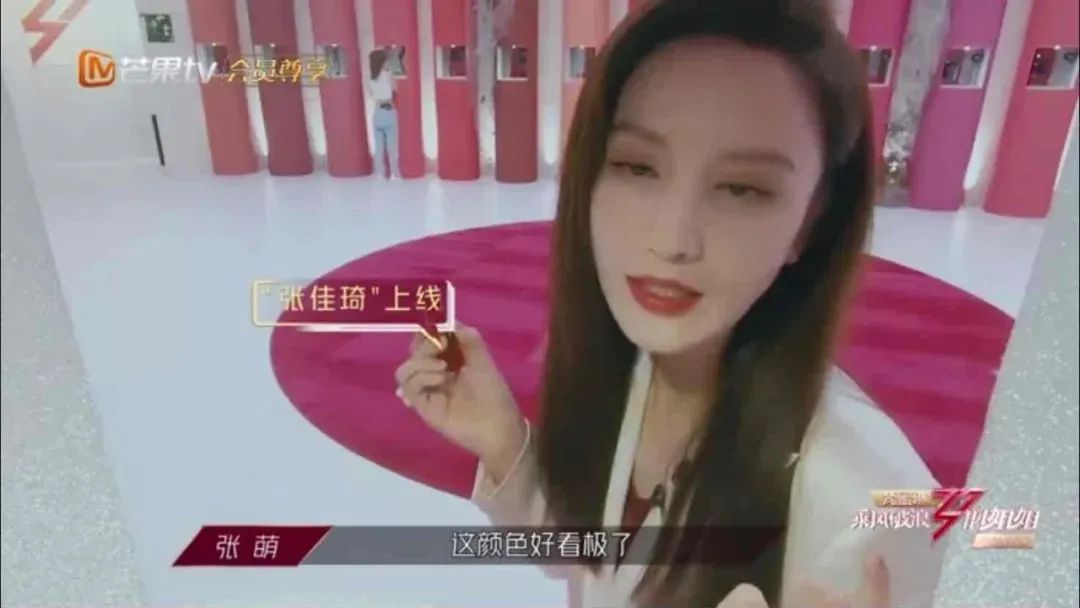 不过,梵蜜琳在场景化植入上还是进行了品牌表现力的玩法展示。在姐姐依次进场时,通过用口红印上唇印这一方式进行签到,口红事实上是梵蜜琳的一个产品植入,但相比起展示品牌logo,梵蜜琳着重在姐姐们选择的色号上进行特写展示,然后通过花字来表示是梵蜜琳的产品,观众在对色号种草后就能立刻知道对应的品牌。