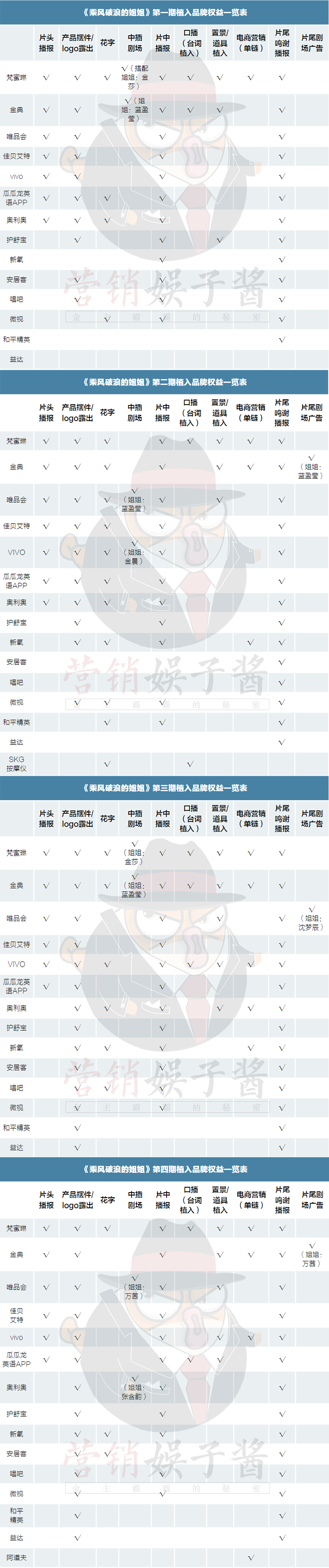 从表中也可看出,从第二期开始,金典和梵蜜琳的权益已不相上下,但越来越多的品牌开始瓜分有限的场景露出和硬广时间,vivo和奥利奥也开始进行中插剧场投放,在第四期中才出现的阿道夫,只选择了电商链接导流这一个方式植入,而佳贝艾特和护舒宝等品牌在四期节目中都未尝试过这一玩法。