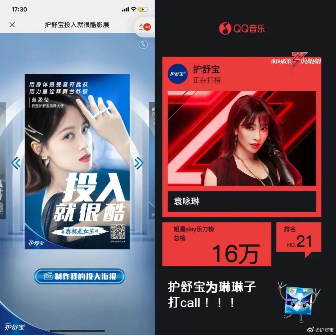 最为受欢迎的姐姐是蓝盈莹,其出现在金典和唯品会的剧场广告中,没有投放剧场广告的护舒宝,则选择了她作为品牌大使。护舒宝在节目内的权益有限,在节目外较为积极地进行跨界联动。它利用蓝盈莹与其他代言人的明星效应,发起一个“我就是女生”的H5影展制作活动,还联合QQ音乐进行音乐打榜,很大程度上在节目外试图触达更多年轻受众。