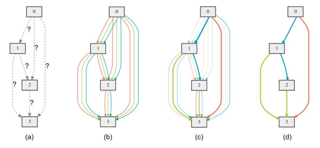 图 4:a) 边上的操作最初是未知的。b) 通过在每个边上放置候选操作的混合来连续释放搜索空间。c) 在双层优化过程(bilevel optimization)中,有些权重增加,而有些下降。d) 最终的架构通过在两个节点之间具备最大权重的边来构建 [8]。
