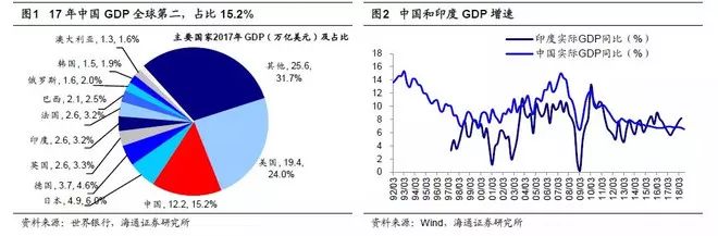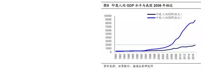 截至2017年,我国GDP总值约12.2万亿美元,在全球GDP中占比15.2%,全球排名第二。目前印度的人均GDP水平还相对较低,截至2017年印度人均GDP为1939美元(相当于中国2006年人均GDP的2099美元),我国为人均8827美元。考虑货币购买力,实际相当于更早期的中国。