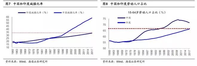中国和印度都是人口大国,但人口年龄结构差异较大。截至2017年,印度人口总量13.4亿,略低于我国人口总量的13.9亿。但印度城镇人口占比仅32.4%,相当于我国1998年的城镇化率33%,明显低于目前我国城镇化率58.5%。