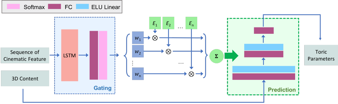 图4. Gating+Prediction网络,Gating输入一长段拍摄序列,输出一组expert值,prediction采用自回归的方式,从过去1s的拍摄和expert推断出下一帧的相机toric坐标