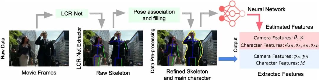 首先,通过 LCR-Net[3]的方法先将屏幕中人物的 2D 骨架提取出来,经过人物匹配,只保留两位“主角”的信息(因为 toric space 有且仅有两个目标),然后将人物骨架的 2D 屏幕坐标输入网络,估计相机坐标和演员信息。