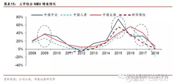 NBV高增长,助推保险股走强。新业务价值既体现新单规模,也体现具体的产品结构质态,是市场最为关心的负债端核心指标,其变动直接影响估值指标EV的增幅。上市险企2009年、2015年和2017年的NBV增速均较为可观,分别实现约20%、15%和50%的增长,我们认为市场对NBV增速提升的预期提振板块表现,助推保险股走强。