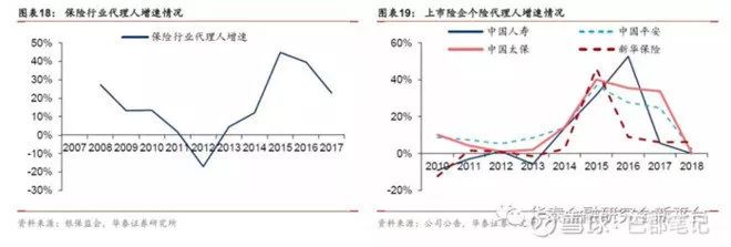 代理人队伍扩张渠道优化,助推价值率攀升。个险渠道代理人是保险公司核心竞争力之一,渠道价值率较高,是各大险企主要推动的发展方向。2012年由于经济下行压力导致增员困难,保险行业个险代理人为负增长,而2014年开门红销售表现超预期推动代理人增员难度降低,规模实现较大幅度提升。2015年4月保险代理人资格考试取消,直接推动2015-16年个险代理人规模的快速提升,全行业实现约40%的连续上涨,除新华保险主动转型调结构外,其他上市险企均实现20%以上的增长。在规模增长的基础上,举绩率、留存率与产能成为重要考核指标,特别是2018年开门红销售乏力导致代理人脱落率增加,倒逼队伍建设向高质量发展,我们认为未来代理人规模会稳中提升,且质态改善将成为主要发展方向,进而推动价值率进一步攀升。
