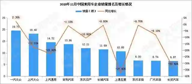 行业数据显示,2018年10月,国内汽车产销量环比均呈一定下降,同比降幅更为明显,延续了7月份以来下降走势。1-10月,汽车产销同比双双下降,为今年首次负增长。11月乘用车销量排名前十的车企中,仅一汽大众销量正增长,其他有不同程度下滑。