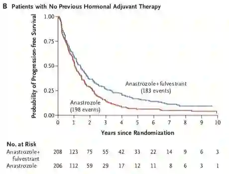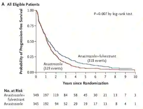 在无疾病进展的患者中,经超过12年的随访,选择性雌激素受体下调剂氟维司群和AI阿那曲唑的组合作为绝经后激素受体阳性转移性乳腺癌患者的一线内分泌治疗,对比阿那曲唑单药,能够显著延长PFS和OS,且前期未经内分泌治疗的患者更应选择氟维司群和阿那曲唑的联合方案。