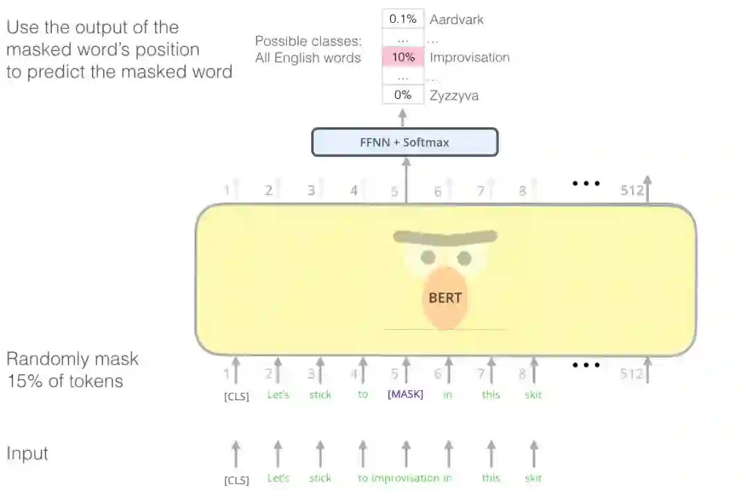 BERT 在语言建模任务中,巧妙地屏蔽了输入中 15% 的单词,并让模型预测这些屏蔽位置的单词。