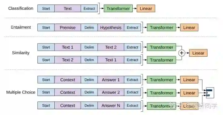 OpenAI 的论文列出了一些列输入变换方法,来处理不同任务类型的输入。下面这张图片来源于论文,展示了执行不同任务的模型结构和对应输入变换。这些都是非常很巧妙的做法。