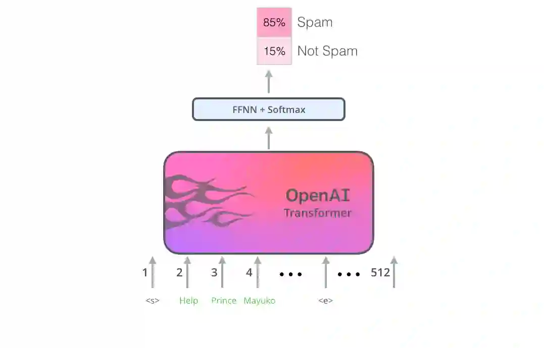 现在,OpenAI Transformer 已经经过了预训练,它的网络层经过调整,可以很好地处理文本语言,我们可以开始使用它来处理下游任务。让我们先看下句子分类任务(把电子邮件分类为 ”垃圾邮件“ 或者 ”非垃圾邮件“):
