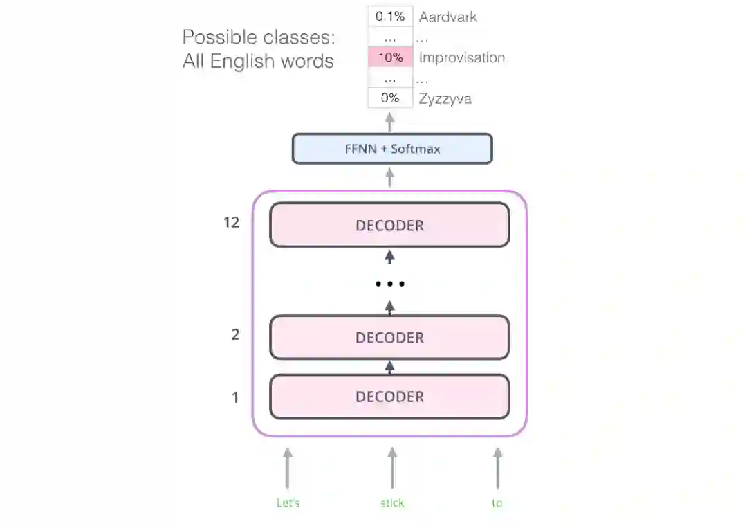这个模型包括 12 个 Decoder 层。因为在这种设计中没有 Encoder,这些 Decoder 层不会像普通的 Transformer 中的 Decoder 层那样有 Encoder-Decoder Attention 子层。不过,它仍然会有 Self Attention 层(这些层使用了 mask,因此不会看到句子后来的 token)。