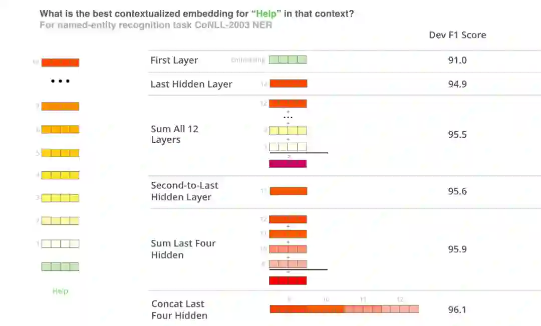 使用 BERT 并不是只有微调这一种方法。就像 ELMo 一样,你可以使用预训练的 BERT 来创建语境化的词嵌入。然后你可以把这些词嵌入用到你现有的模型中。论文里也提到,这种方法在命名实体识别任务中的效果,接近于微调 BERT 模型的效果。