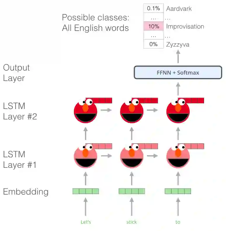 ELMo 预训练过程的其中一个步骤:以 "Let’s stick to" 作为输入,预测下一个最有可能的单词。这是一个语言建模任务。当我们在大规模数据集上训练时,模型开始学习语言的模式。例如,在 "hang" 这样的词之后,模型将会赋予 "out" 更高的概率(因为 "hang out" 是一个词组),而不是 "camera"。