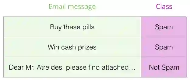 由于我们在讨论分类器,这属于机器学习的监督学习领域。这意味着我们需要一个带有标签的数据集来训练这样一个模型。例如,在下面这个垃圾邮件分类器的例子中,带有标签的数据集包括一个邮件内容列表和对应的标签(每个邮件是“垃圾邮件”或者“非垃圾邮件”)。