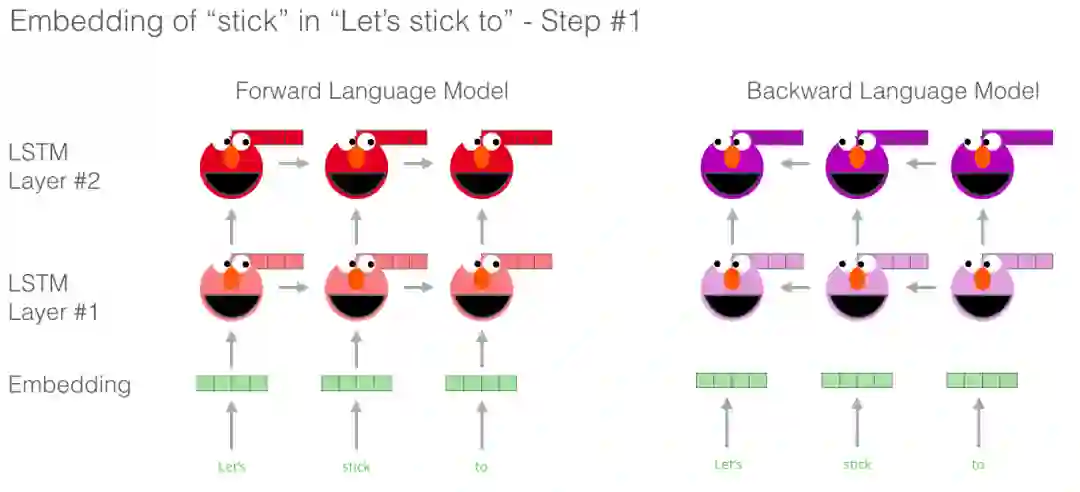 在上图中,我们可以看到 ELMo 头部上方展示了 LSTM 的每一步的隐藏层状态向量。在这个预训练过程完成后,这些隐藏层状态在词嵌入过程中派上用场。