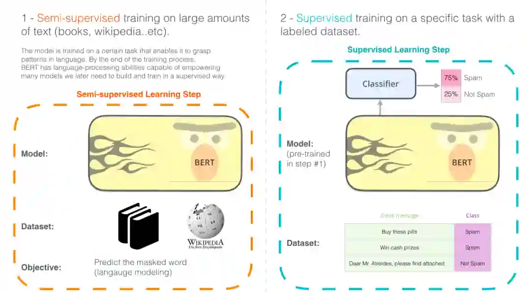BERT 开发的两个步骤:第 1 步,你可以下载预训练好的模型(这个模型是在无标注的数据上训练的)。然后在第 2 步只需要关心模型微调即可。