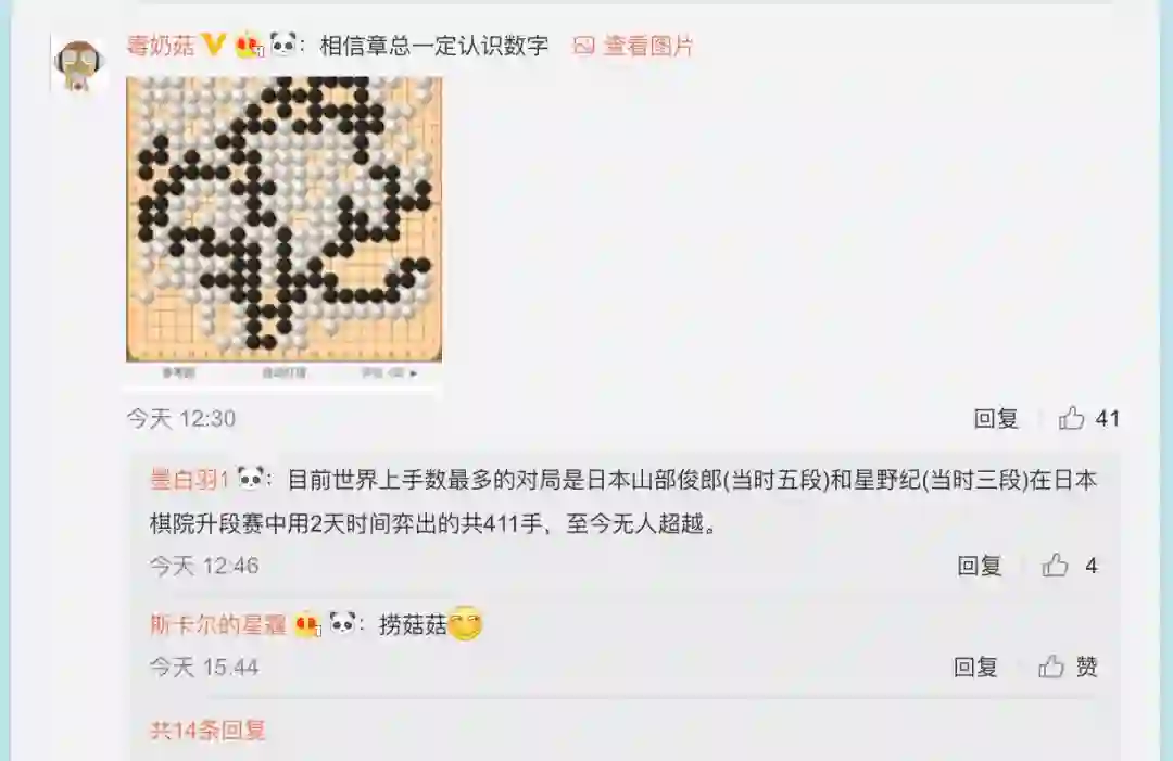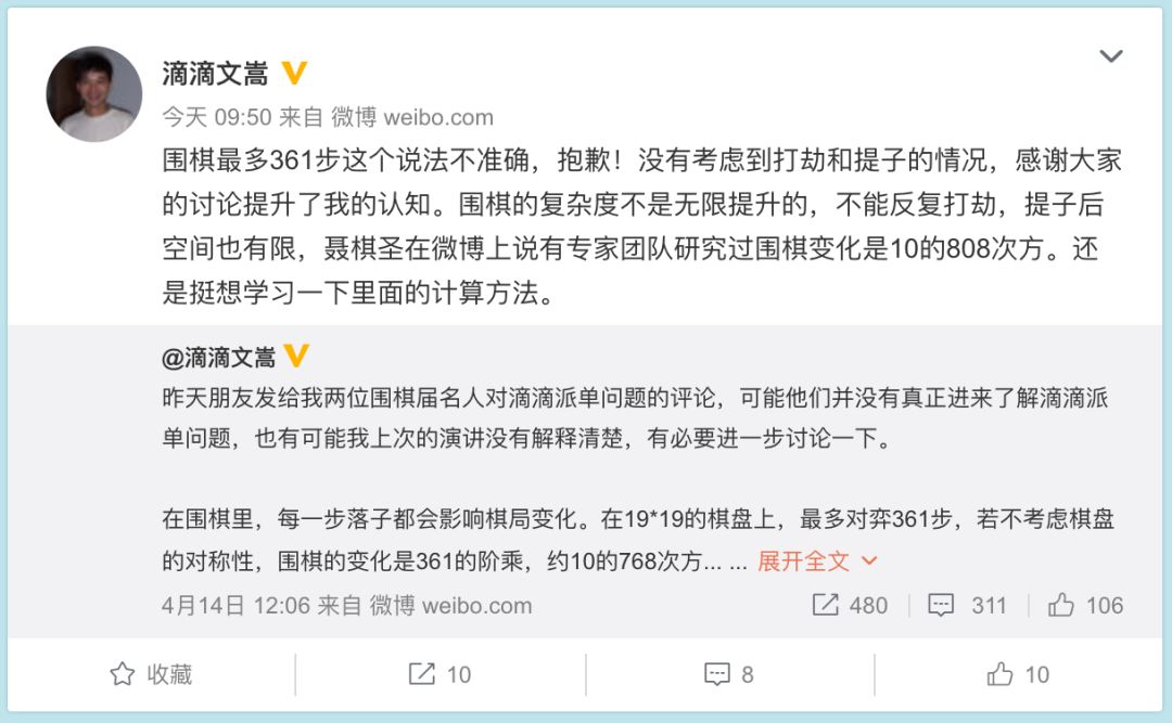 章文嵩:围棋最多361步这个说法不准确,抱歉!没有考虑到打劫和提子的情况,感谢大家的讨论提升了我的认知。围棋的复杂度不是无限提升的,不能反复打劫,提子后空间也有限,聂棋圣在微博上说有专家团队研究过围棋变化是10的808次方。还是挺想学习一下里面的计算方法。