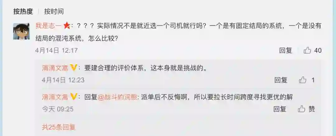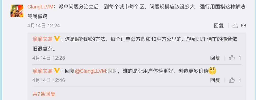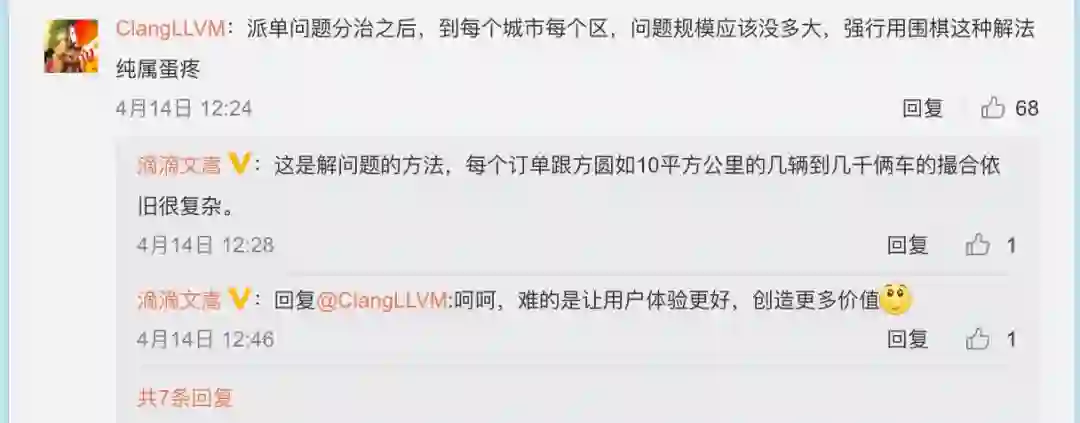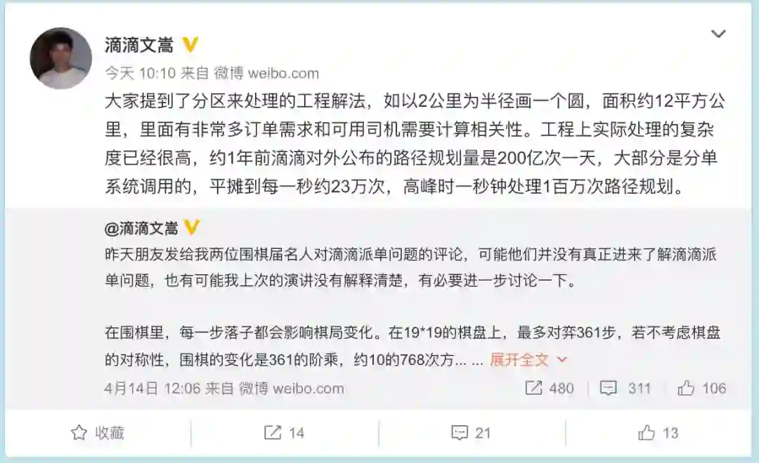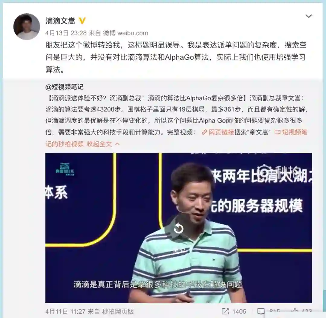 章文嵩指出标题有误,他微博回复称:朋友把这个微博转给我,这标题明显误导。我是表达派单问题的复杂度,搜索空间是巨大的,并没有对比滴滴算法和AlphaGo算法,实际上我们也使用增强学习算法。