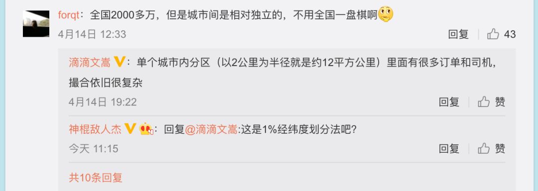 章文嵩:大家提到了分区来处理的工程解法,如以2公里为半径画一个圆,面积约12平方公里,里面有非常多订单需求和可用司机需要计算相关性。工程上实际处理的复杂度已经很高,约1年前滴滴对外公布的路径规划量是200亿次一天,大部分是分单系统调用的,平摊到每一秒约23万次,高峰时一秒钟处理1百万次路径规划。
