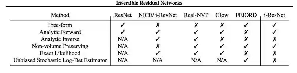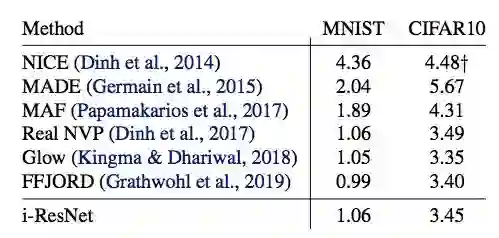 表 1:i-ResNet、ResNet 与 NICE (Dinh et al., 2014)、Real-NVP (Dinh et al., 2017)、Glow (Kingma & Dhariwal, 2018) 及 FFJORD (Grathwohl et al., 2019) 的对比结果。「Non-volume Preserving」指允许收缩和扩张的能力,以及计算变量 (3) 变化的确切似然。「Unbiased Estimator」是指对数行列式的随机近似。
