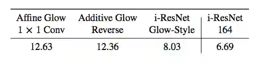 表 3:i-ResNet 与最新技术 Glow 在 CIFAR10 数据集上的分类结果。这里对比了两个版本的 Glow 和与 Glow 层数、通道数都类似的 i-ResNet 架构(i-ResNet, Glow-Style)。