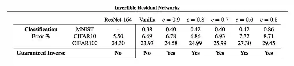 这种方法允许每个残差块的无约束架构,而每个块只需要小于 1 的 Lipschitz 常数。研究者证明,在构建图像分类器时,这种限制对性能的影响可以忽略不计——在对 MNIST、CIFAR10 和 CIFAR100 图像进行分类时,它们的性能与不可逆的同类分类器相当。