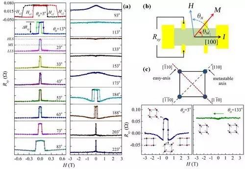(a) 不同磁场角度下的平面霍尔效应;(b) 转角平面霍尔测量结构示意图;(c)平面磁各向异性示意图。