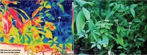 相同环境下,干热河谷植物(HD)和热带雨林植物(HW)的叶片红外温度图像