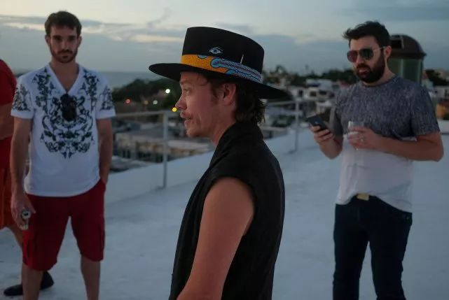其他的波托帮人坐着大巴在外面找到一天的土地,回来之后也都来到屋顶上。中间是37岁的布鲁克·皮尔斯(Brock Pierce),他身着一件黑色背心,几乎盖到膝盖,还戴着一顶黑色毡帽。他和其他人去年12月初抵达该岛。