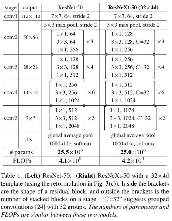 我们经常见的ResNeXt-101(32x4d)就是深度为101的上面的网络结构。