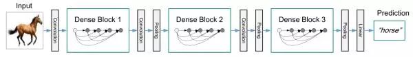 作者认为直接相加的方式会阻碍信息在网络的流动,所以很简单的实现就是将所有的feature map直接拼接。但这种直接的拼接方式会使得最后得到的featuremap通道数急剧增加,因此作者并没有将这种方式应用到整个网络,而是设计成Dense Block,整个网络方式如下图: