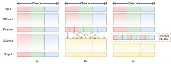 channel shuffle具体实现:假设有gxn个通道,首先将其reshape成(g, n),然后再转置为(n, g), 进行flatten操作,再分为g组作为下一层的输入!