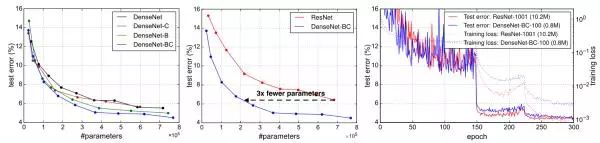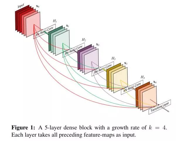 本篇论文从图中可以看出,是对ResNet进行了改进,作者总结了一下近几年的文章,在提高网络性能方面要么网络越深,要么网络越宽,但作者使用了一个更为激进的特征重用策略,把ResNet的单层特征重用扩展到多层,但参数量更少。相比于ResNet,其有很多优点,比如多层直接连接加强了特征的传递,减轻了梯度消失的现象,减少了参数量!正是因为参数量的减少,其具有一定的防止过拟合的能力!
