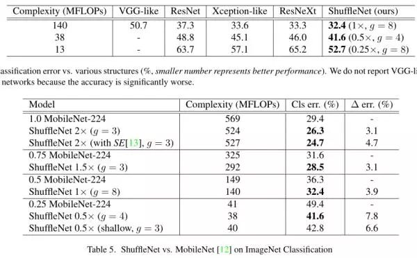 在第一版中,应用了两种技术:pointwise group convolution和bottlenect-like,接着使用了一个channel shuffle的模块用来增加通道之间的交流性同时提高精度。那么根据我们上面提出的四个CNN高效化设计的准则,第一版有什么不足呢?