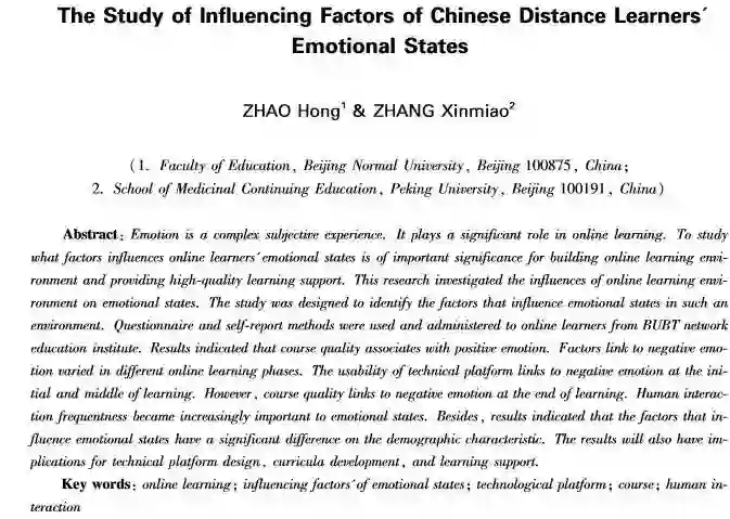 关键词:在线学习;情绪影响因素;技术平台;课程;人际交互