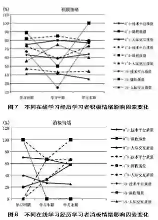 对于1〜3年学习者而言,在三个阶段,课程质量的影响先降后升,但一直都是影响其消极情绪的最主要因素,尤其是在学习初期和末期,选择课程质量作为影响因素的人数比例达100%。随着学习的推进,技术平台质量和人际交互质量的影响显著增强。在学习中期,课程质量和技术平台质量并列成为影响1〜3年学习者消极情绪的主要因素。对于3年以上学习者而言,消极情绪主要存在于学习初期,技术平台质量、课程质量和人际交互质量是产生消极情绪的主要因素。