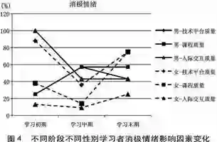 由图4可以看出,在不同学习阶段,不同性别学习者消极情绪的影响因素变化较大。对于男性学习者而言,在学习初期,人际交互质量是最重要的影响因素;随着学习进程的推进,人际交互质量的影响急速下降,课程质量和技术平台质量的影响显著增加;到学习末期,课程质量成为男性消极情绪的最重要影响因素。对于女性学习者而言,在学习初期,技术平台质量是其消极情绪最重要的影响因素,其次是课程质量;在学习中期,技术平台质量和课程质量的影响显著下降;到了末期,课程质量、技术平台质量影响又都呈显著上升趋势,成为女性学习者产生消极情绪的最主要因素;同时,人际交互质量对女性学习者消极情绪的影响在学习末期也呈上升趋势。
