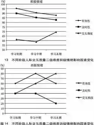 由图14可以看出,对于以消极情绪为主的学习者而言,在不同学习阶段,所选择的影响因素比例发生了明显变化。学习初期选择有效性的人数比例最高,及时性和交互频度的人数比例相当。在学习中期,选择有效性和交互频度的人数比例明显增加,而选择及时性的人数比例保持稳定。在学习末期,选择有效性的人数降低,恢复到学习初期的水平,而选择交互频度的人数比例继续增加,高达80%,选择及时性的人数比例则降到20%。