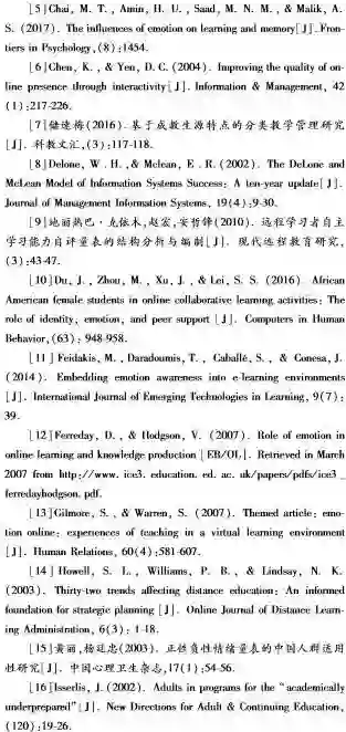 在线学习的本质特征决定了情绪在其中发挥的重要作用。本研究探索了影响学习者在线学习情绪的环境因素,证明了系统质量、内容质量和人际交互质量是影响成人在线学习情绪状态的关键。但在线学习者情绪涵盖了包括技术、内容和服务在内的使用体验。因此,未来的研究可进一步探索影响学习者在线情绪的其他变量,这对于构建良好的网络学习环境和提供高质量的学习支持具有重要意义。