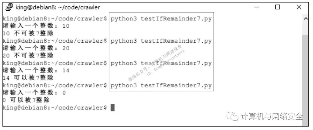 按Esc键,进入命令模式后输入:wq保存testIfRemainder7.py。testIfRemainder7.py要求用户输入一个整数,然后判断这个数能否被7整除,基本就是一个最简单的非此即彼的判断。执行命令: