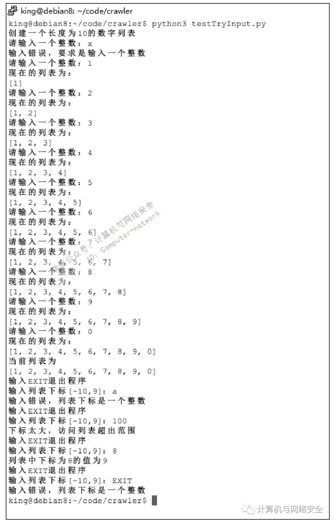 这个程序针对输入出现的异常和访问列表越界的异常给出了解决方案。编程过程中总会遇上各种各样的异常。考虑周到一点,思维缜密一点,善用try一点,程序的健壮性就不止会强一点点。
