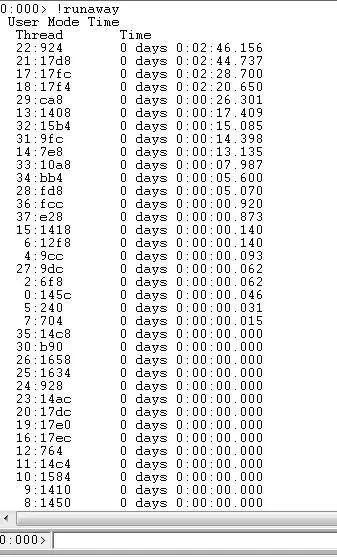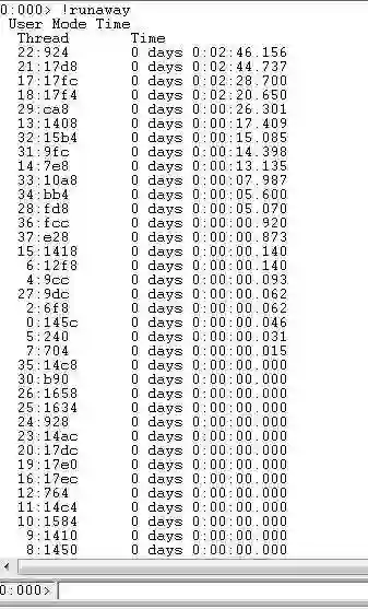 0:000> !runaway ERROR: !runaway: extension exception 0x80004002. "Unable to get thread times - dumps may not have time information"