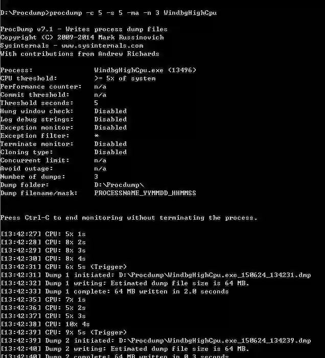procdump [-a] [[-c|-cl CPU usage] [-u] [-s seconds]] [-n exceeds]