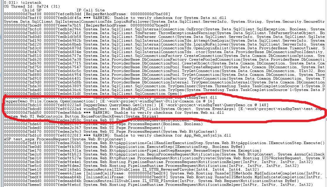 b. 使用!clrstack 命令来查看当前的调用堆栈信息