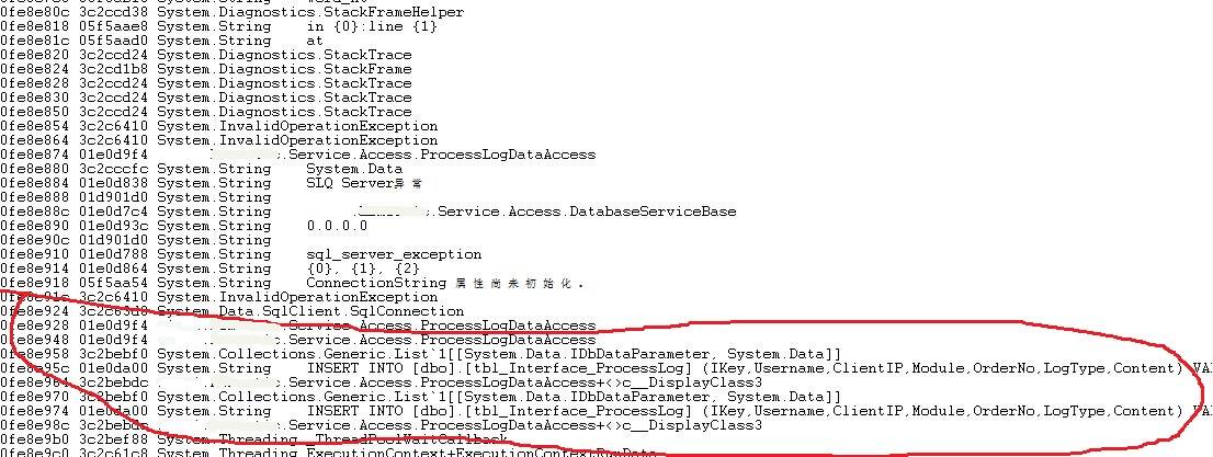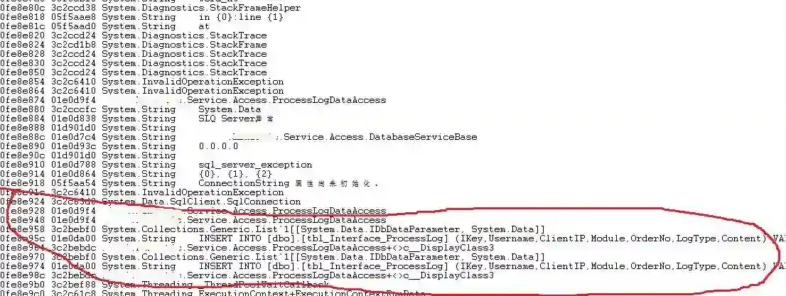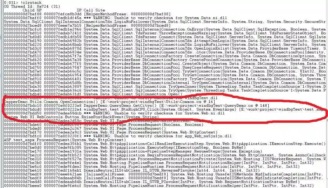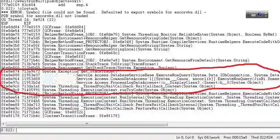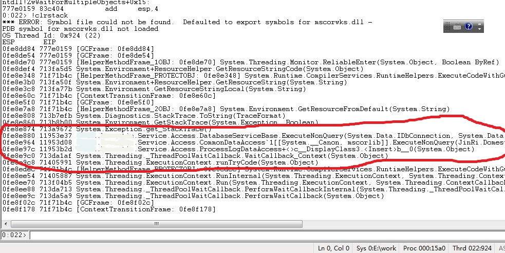 执行!clrstack 命令查看当前线程堆栈变量值的信息,从图中可以猜出大概是 ExecuteNonQuery() 这方法有点问题,如下图所示: